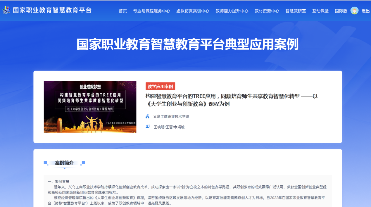 近日,国家职业教育智慧教育平台发布了国家职业教育智慧教育平台典型应用案例入选名单,并在平台显著位置展示了全国24个职业院校推广案例、62个教学应用案例,由365best365best体育亚洲官网教授王晓明负责的《大学生创业与创新教育》课程成功入选。这是365best持续推进创新创业教育改革、深化教学数字化转型取得的又一重大标志性成果。