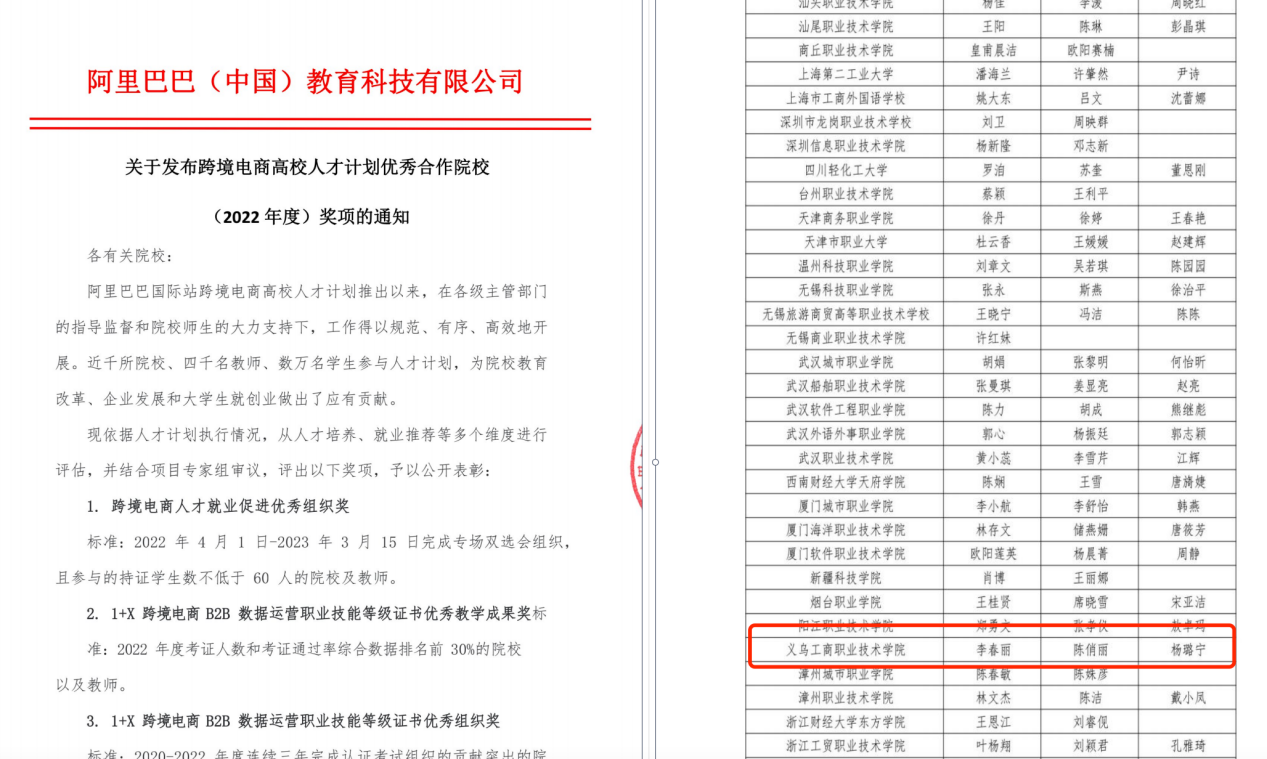 阿里巴巴(中国)教育科技有限公司是“1+X”跨境电商B2B数据运营职业技能等级证书的试点评价组织方,主要聚焦阿里巴巴国际站的人才培养,全国有近千所院校、四千名教师、数万名学生深度参与了该项目。1+X跨境电商B2B数据运营职业技能等级证书优秀教学成果奖标准是2022年度考证人数和考证通过率综合数据排名前30%的院校以及教师。1+X跨境电商B2B数据运营职业技能等级证书优秀组织奖标准是2020-2022年度连续三年完成认证考试组织的贡献突出的院校及教师。
