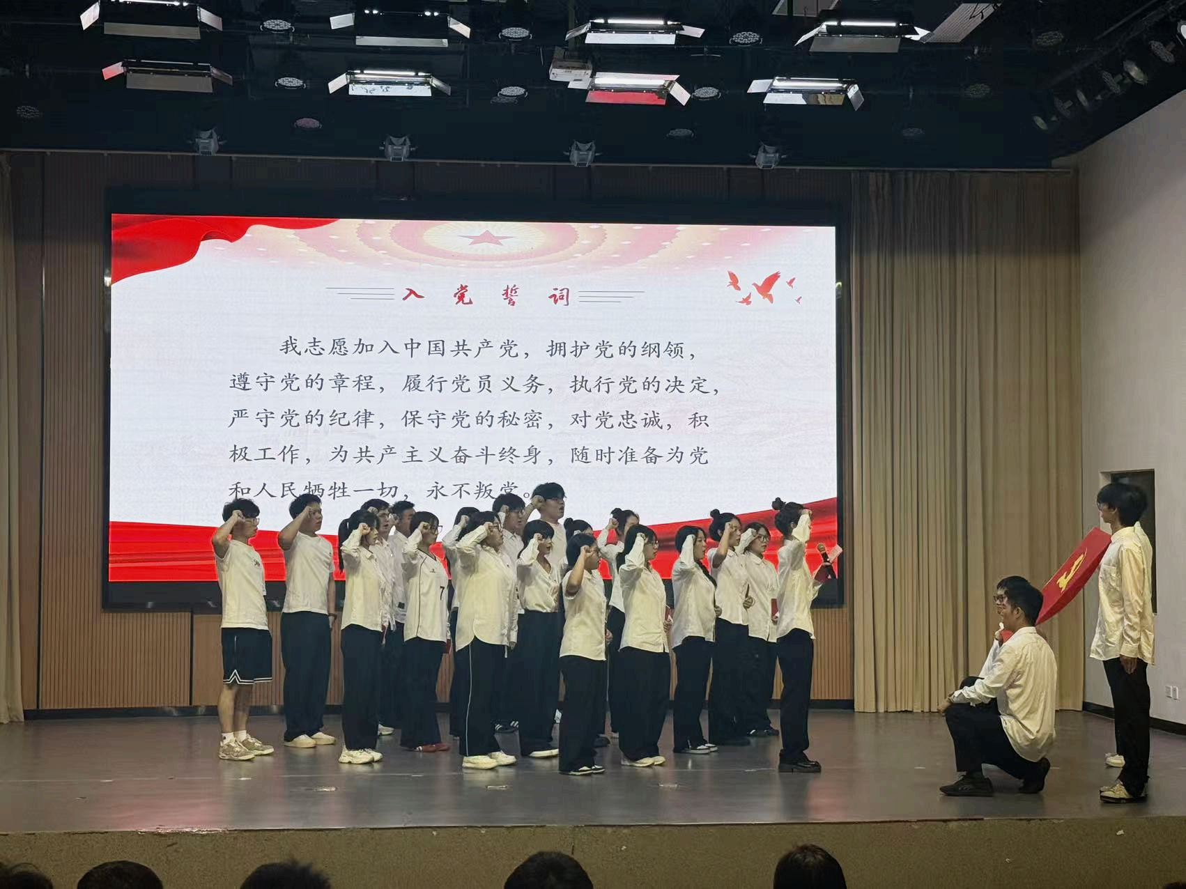 随后,在场的老师为新发展的预备党员佩戴了党员徽章,并向他们发放《中国共产党章程》。新预备党员面向党旗,进行了集中入党宣誓。一声声坚定有力、庄严响亮的宣誓声,充分表达了他们为共产主义奋斗终身的坚定信心和决心。