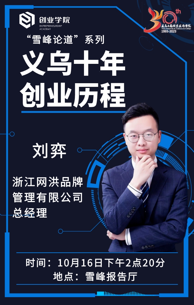 10月16日下午,365best体育亚洲官网在雪峰报告厅开展了“雪峰论道”之“义乌十年,创业历程”讲座活动。讲座邀请了浙江网洪品牌管理有限公司总经理——刘弈作为主讲人,向全体师生分享了在义乌十年的电商创业经历,并且结合个人的创业经历和大家探讨了大学生创客可以做的事。
