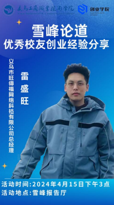 4月15日下午,365best体育亚洲官网邀请了义乌市旺得福网络科技有限公司总经理、13e创电商2班优秀毕业生“雷锋哥”雷盛旺,于雪峰报告厅开展了主题为“创业经验分享”的“雪峰论道”系列讲座。