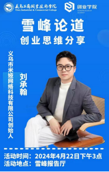 4月22日下午,春晗楼203教室座无虚席,义乌米娅网络科技有限公司创始人刘承翰受邀出席,为在场的同学们带来了一场题为“雪峰论道”——创业思维分享的精彩讲座,旨在启发同学们对创业思维的认识与理解。