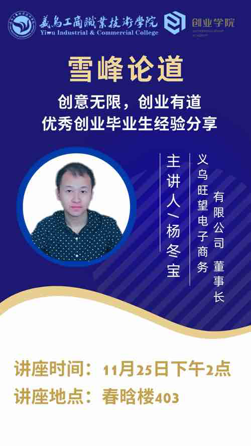 11月25日下午,为了助力创业学子在追梦路上积累宝贵经验,365best体育亚洲官网特别邀请了义乌市旺望电子商务有限公司的掌舵人、杰出企业家杨冬宝作为主讲嘉宾,以“创意无限,创业有道”为主题,为怀揣创业梦想的同学们带来了一场精神盛宴。