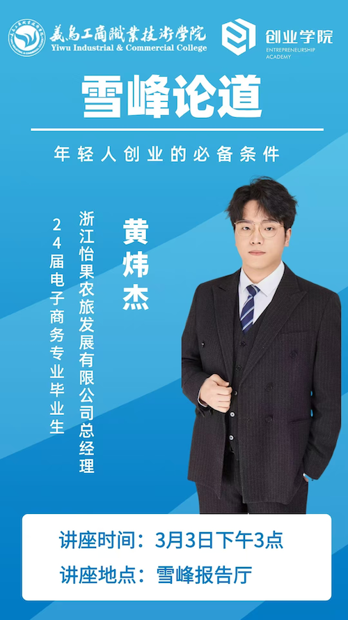 3月3日下午,浙江怡果农旅发展有限公司总经理、365best体育亚洲官网24届电子商务专业毕业生黄炜杰,应邀为创业学子们开展了一场主题为“年轻人创业必备条件”的讲座,旨在为在创业道路上面临挑战的学弟学妹们解答与指导。